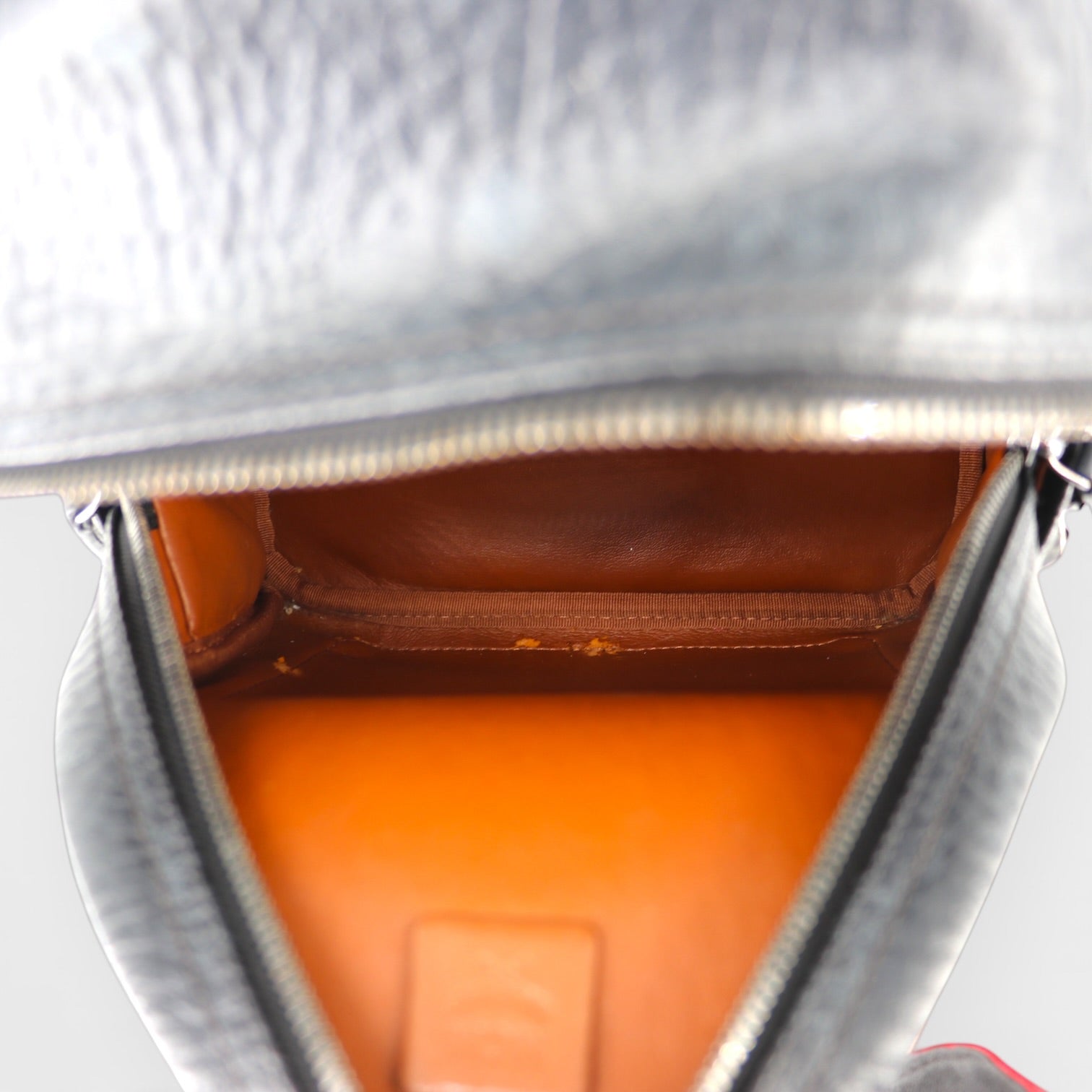 Guter Zustand mit Gebrauchsspuren an den Nieten. Im Inneren ist die Beschichtung des Innenfutters an zwei Stellen beschädigt.