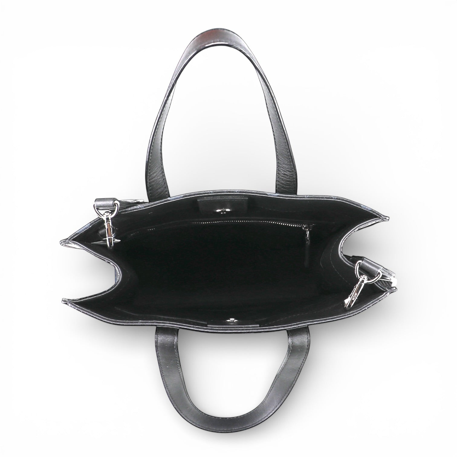 Das Innere ist mit schwarzem Textil ausgekleidet und bietet eine übersichtliche, praktische Aufteilung: ein geräumiges Hauptfach, das ausreichend Platz für die täglichen Essentials bietet sowie ein flaches Einschubfach für kleinere Gegenstände wie Smartphone, Kartenetui oder Schlüssel.