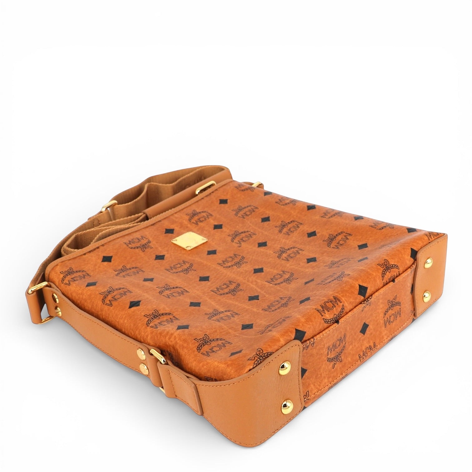 Hochwertige Lederbesätze verstärken die Kanten und sorgen für zusätzliche Stabilität. Die goldfarbenen Metallbeschläge setzen elegante Akzente und verleihen der Tasche eine luxuriöse Ausstrahlung. Das ikonische MCM-Logo-Emblem auf der Vorderseite rundet das Design stilvoll ab.