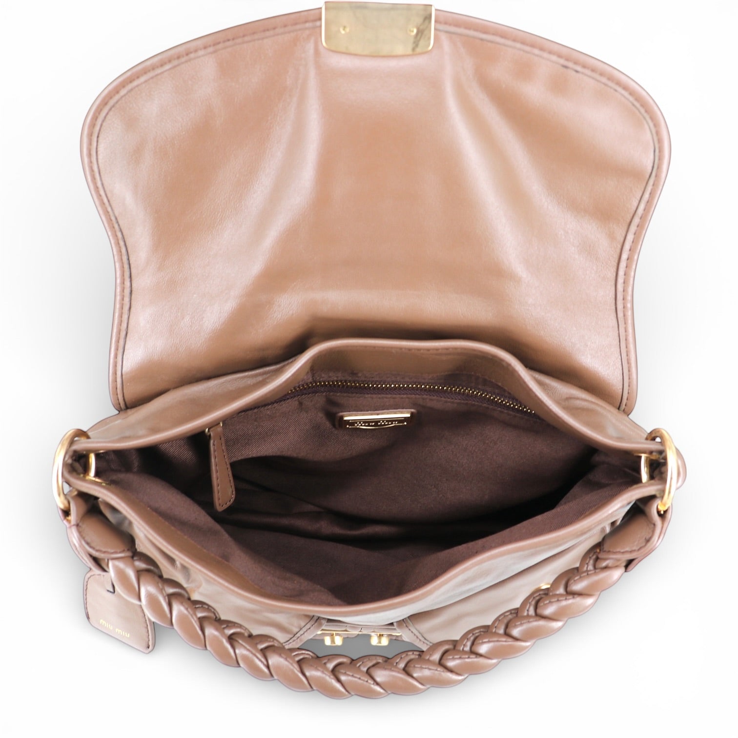 Edle goldfarbene Metallbeschläge setzen glamouröse Akzente und bilden einen harmonischen Kontrast zum warmen Braunton des Leders. Der dekorative Verschluss auf der Front verleiht der Tasche einen markanten, leicht nostalgischen Charakter und unterstreicht die typische Miu-Miu-Ästhetik.