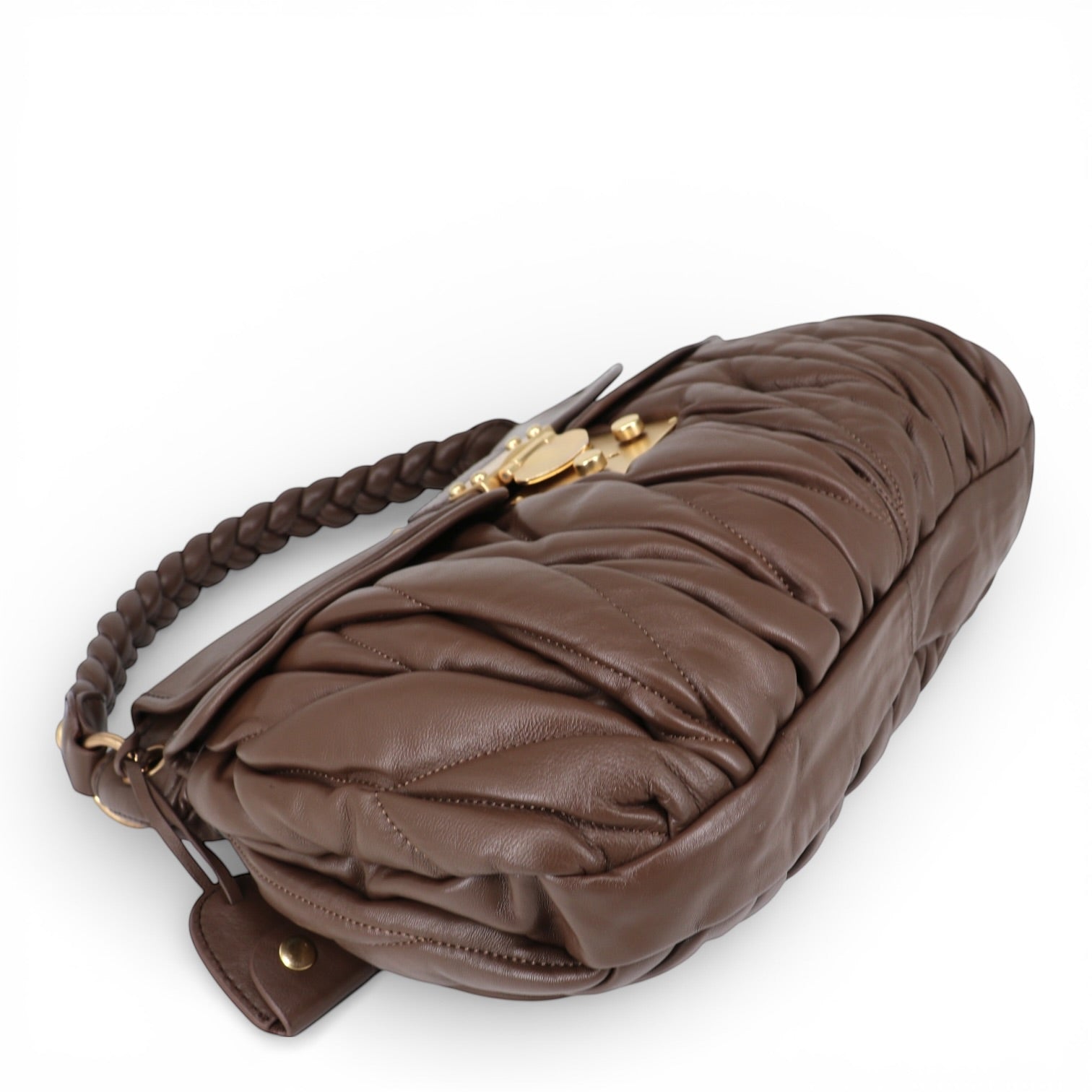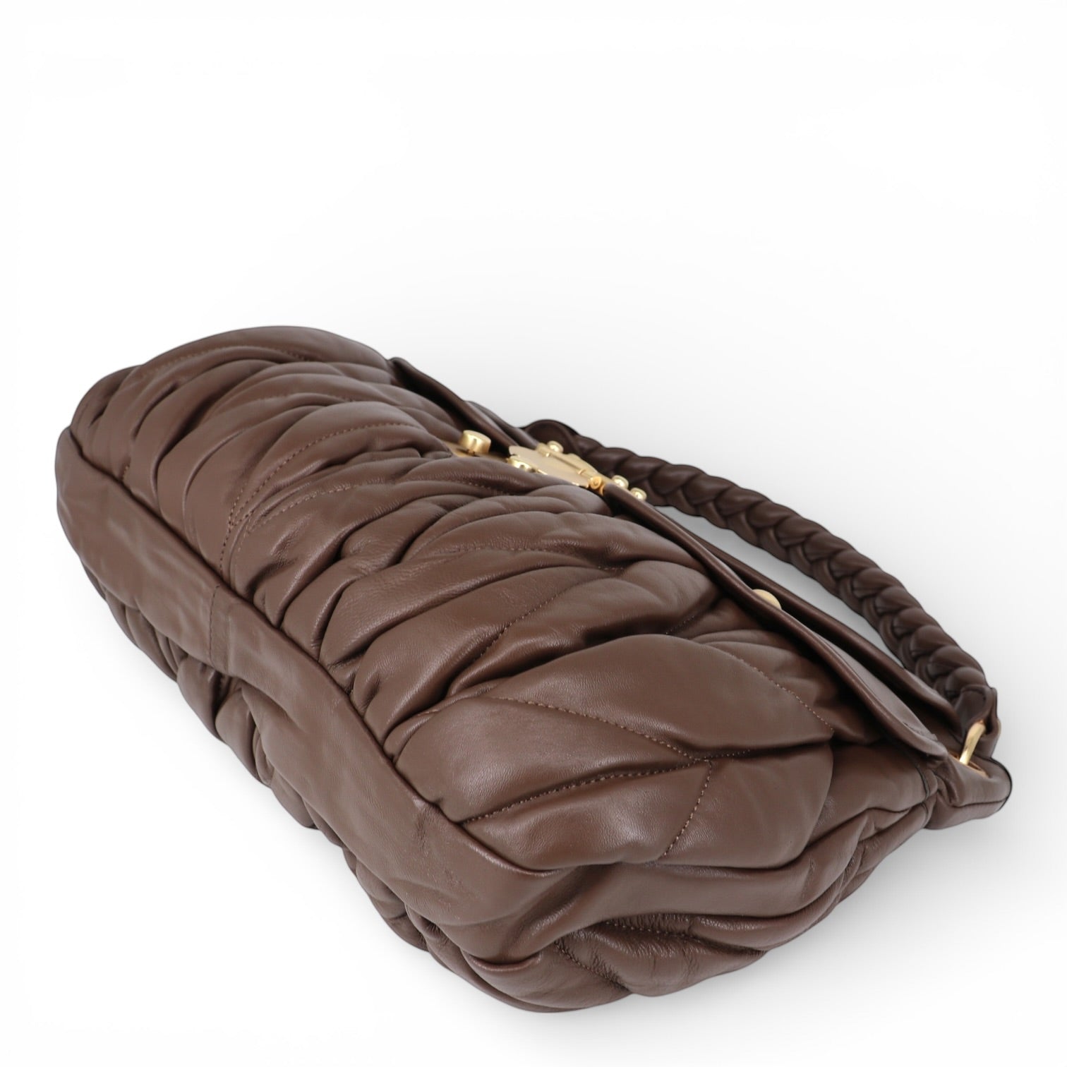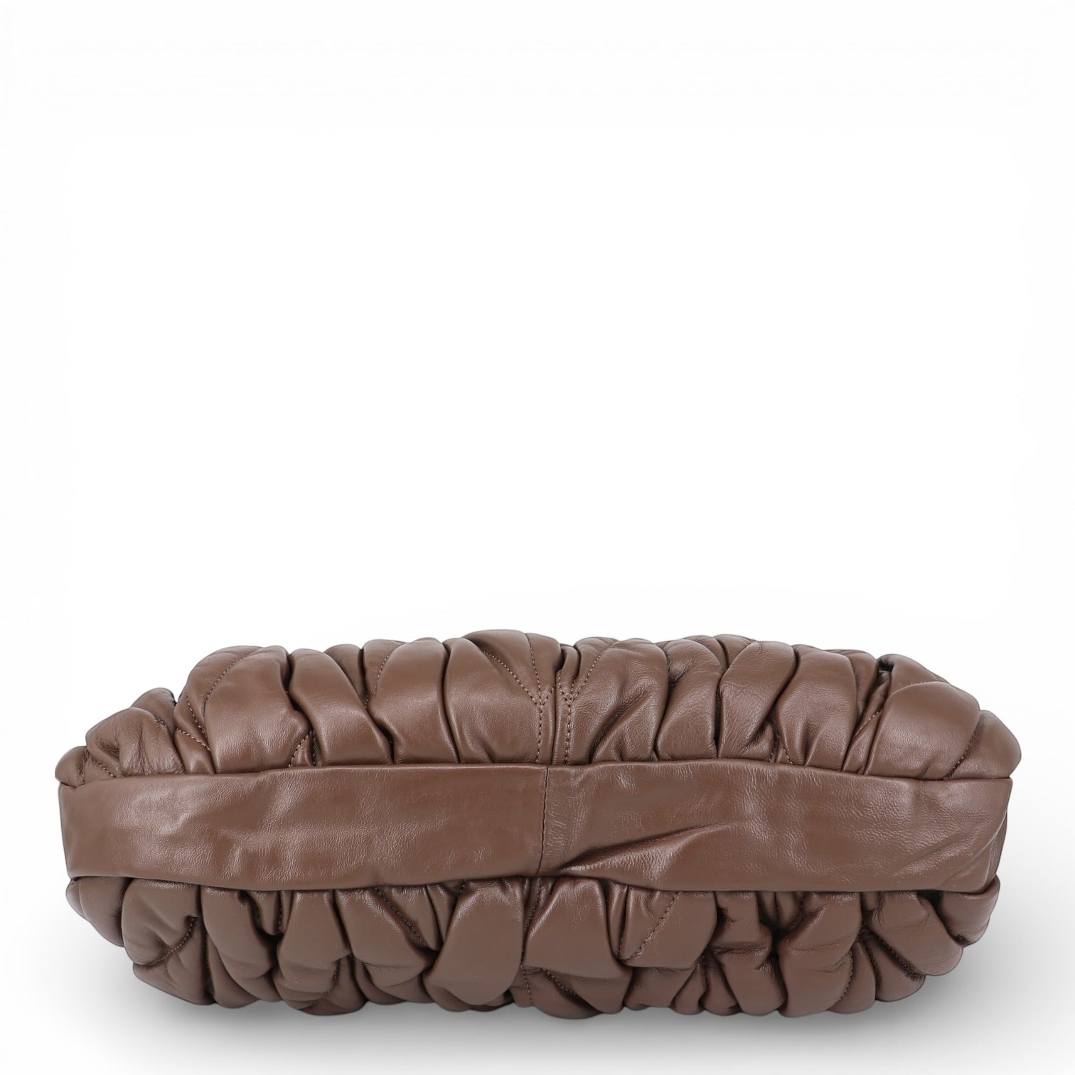 Gefertigt aus hochwertigem braunem Matelassé-Leder, besticht die Tasche durch die charakteristische, weich geraffte Steppoptik, die dem Modell eine besondere Tiefe und eine edle, voluminöse Struktur verleiht. Das geschmeidige Leder unterstreicht den luxuriösen Look und sorgt gleichzeitig für eine angenehme Haptik.