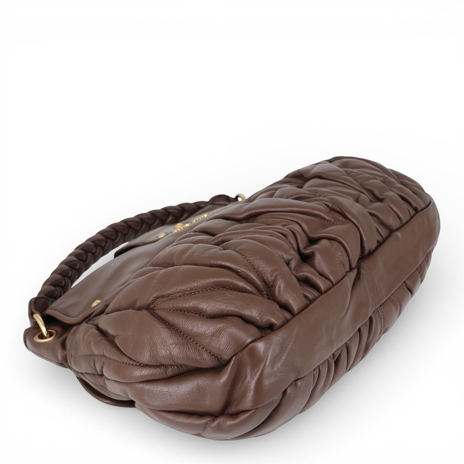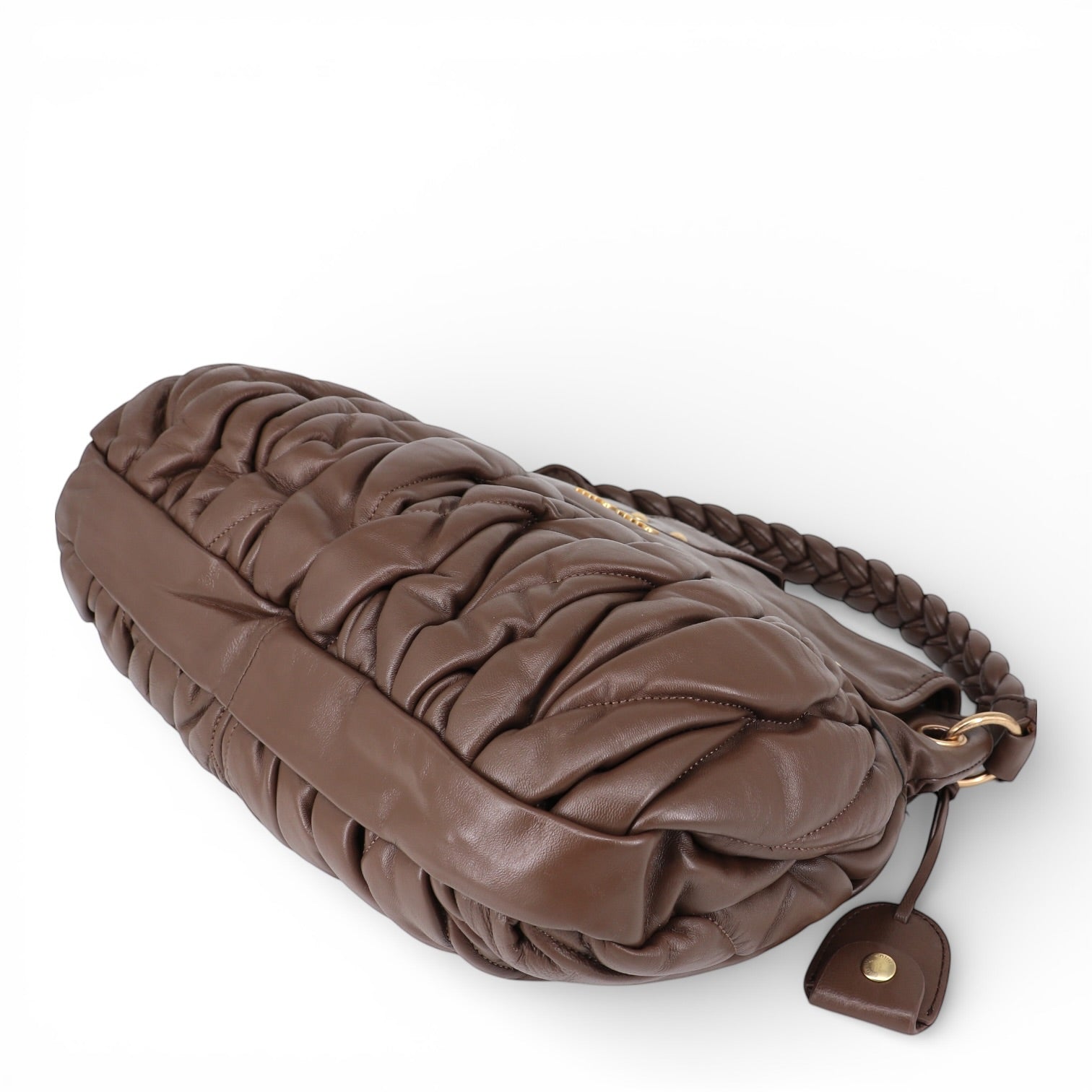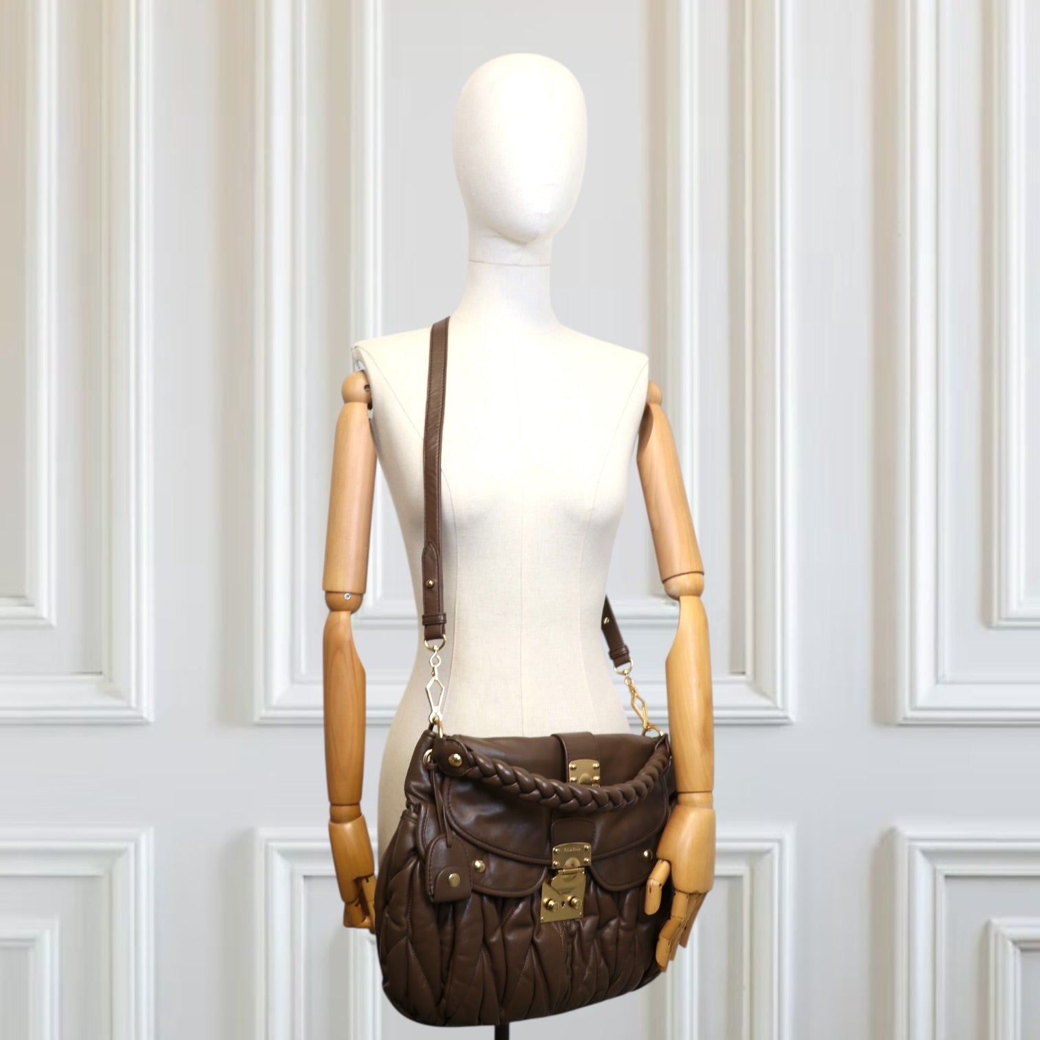 Gefertigt aus hochwertigem braunem Matelassé-Leder, besticht die Tasche durch die charakteristische, weich geraffte Steppoptik, die dem Modell eine besondere Tiefe und eine edle, voluminöse Struktur verleiht. Das geschmeidige Leder unterstreicht den luxuriösen Look und sorgt gleichzeitig für eine angenehme Haptik.