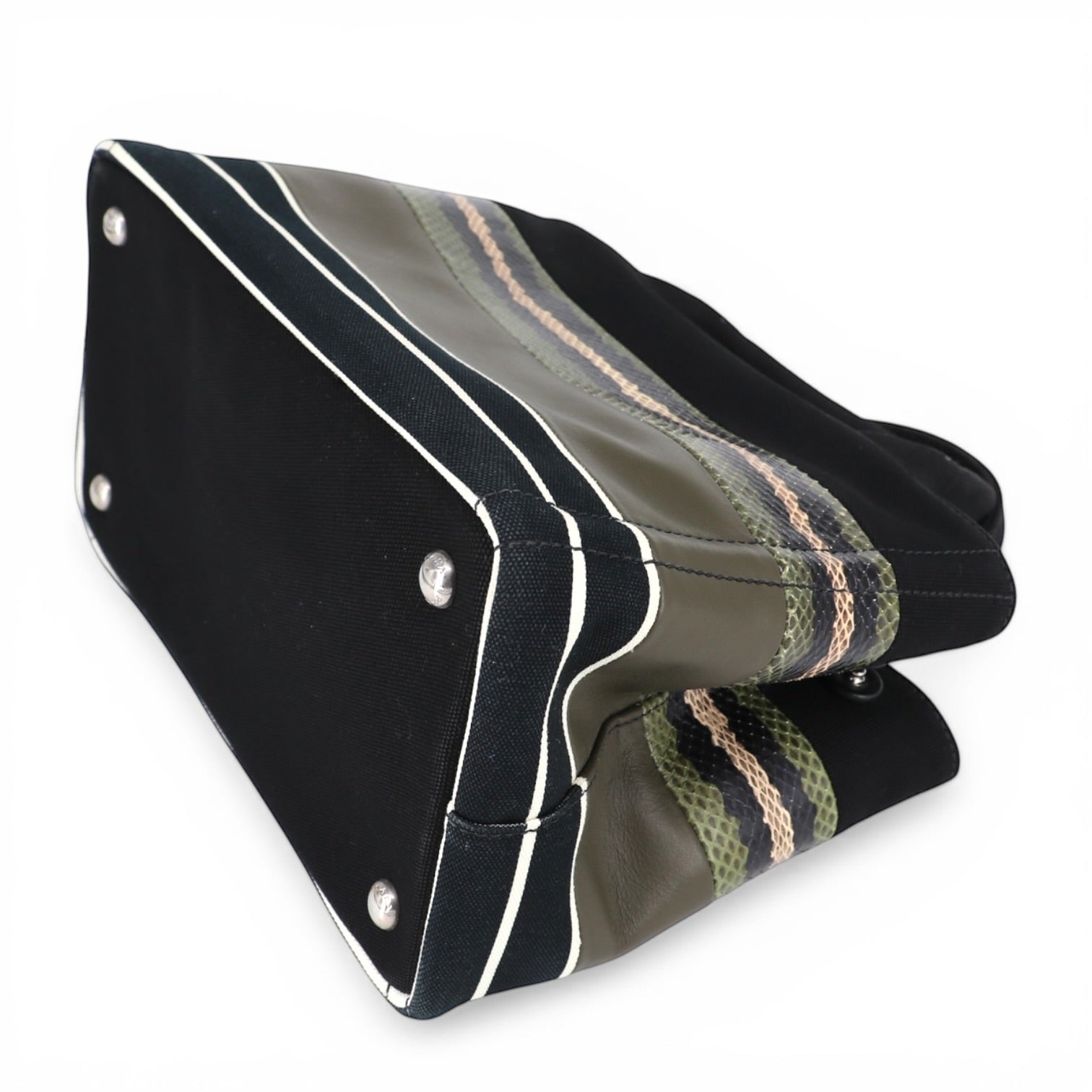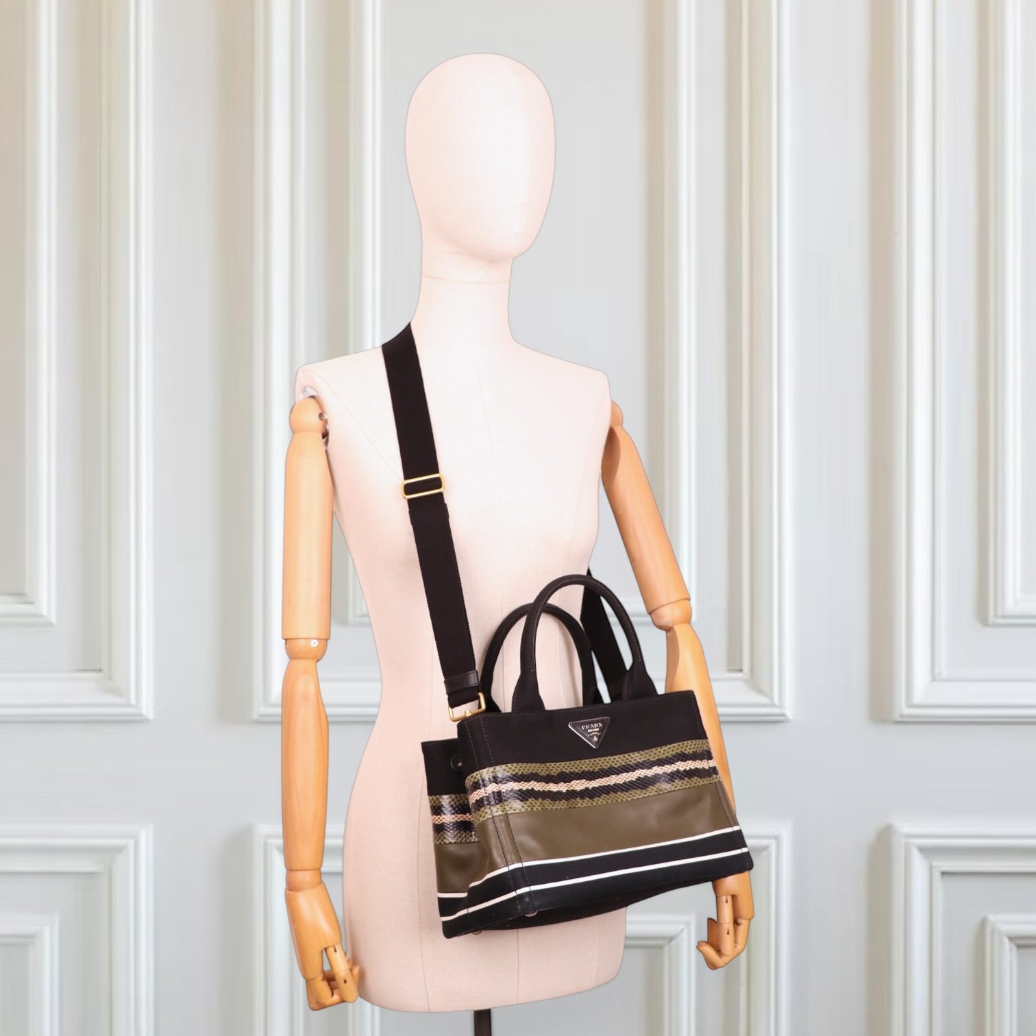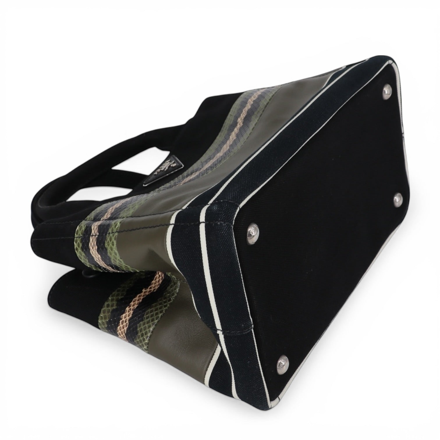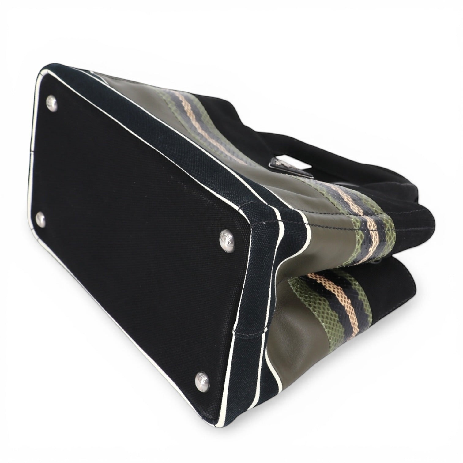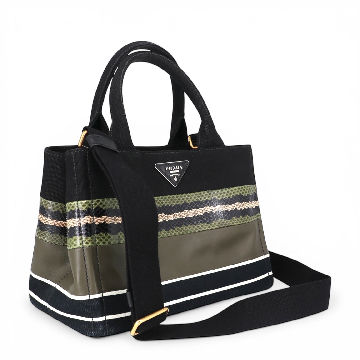 Die Prada Canapa verbindet sportlichen Chic mit luxuriösen Materialien. Durch die Kombination aus Canvas, Leder und Pythonleder wirkt sie zugleich modern und exklusiv.