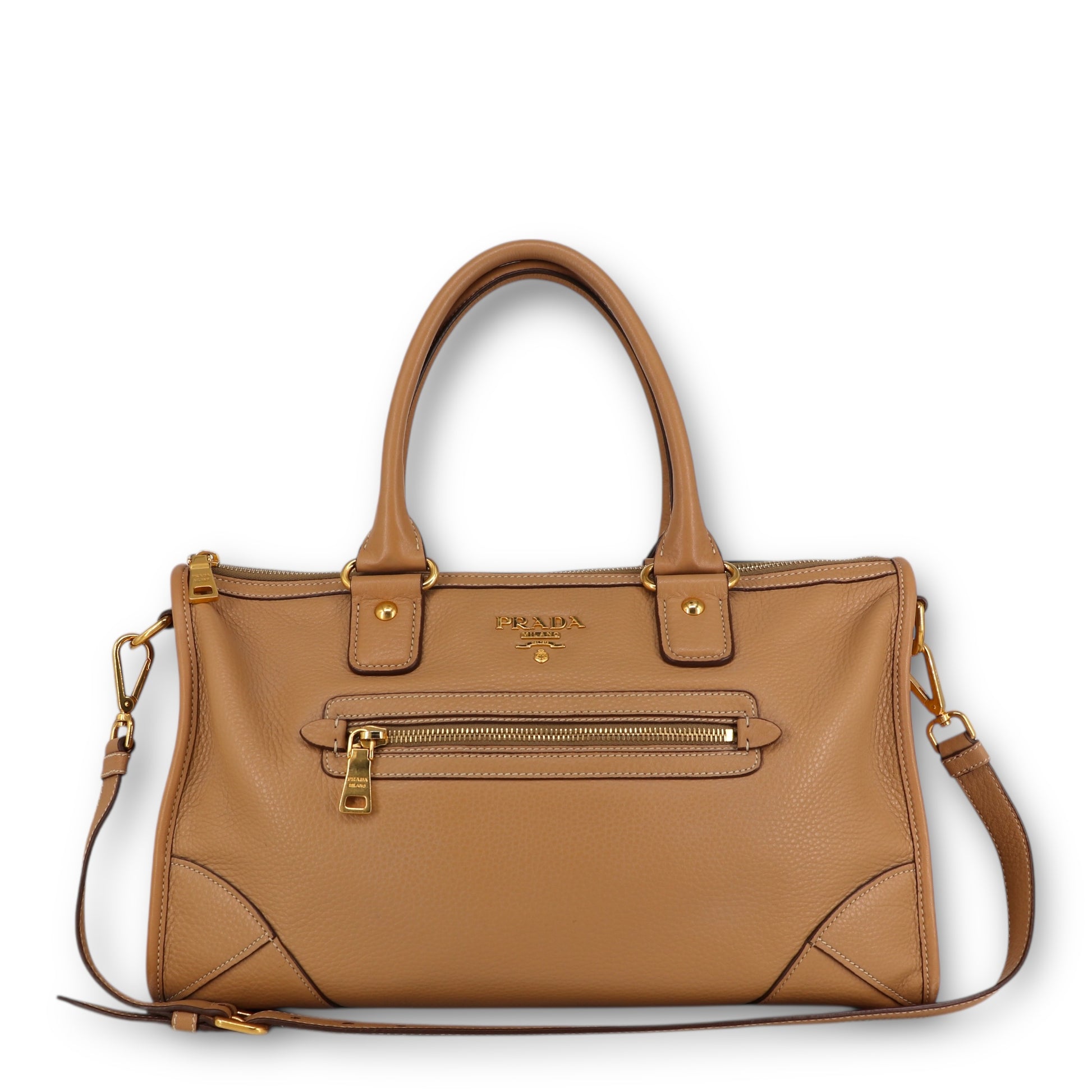 Diese edle Prada Handtasche vereint zeitlose Eleganz mit funktionalem Design. Gefertigt aus hochwertigem, genarbtem Leder in einem warmen Camelton, überzeugt sie durch ihre strukturierte Form und goldfarbene Metalldetails.