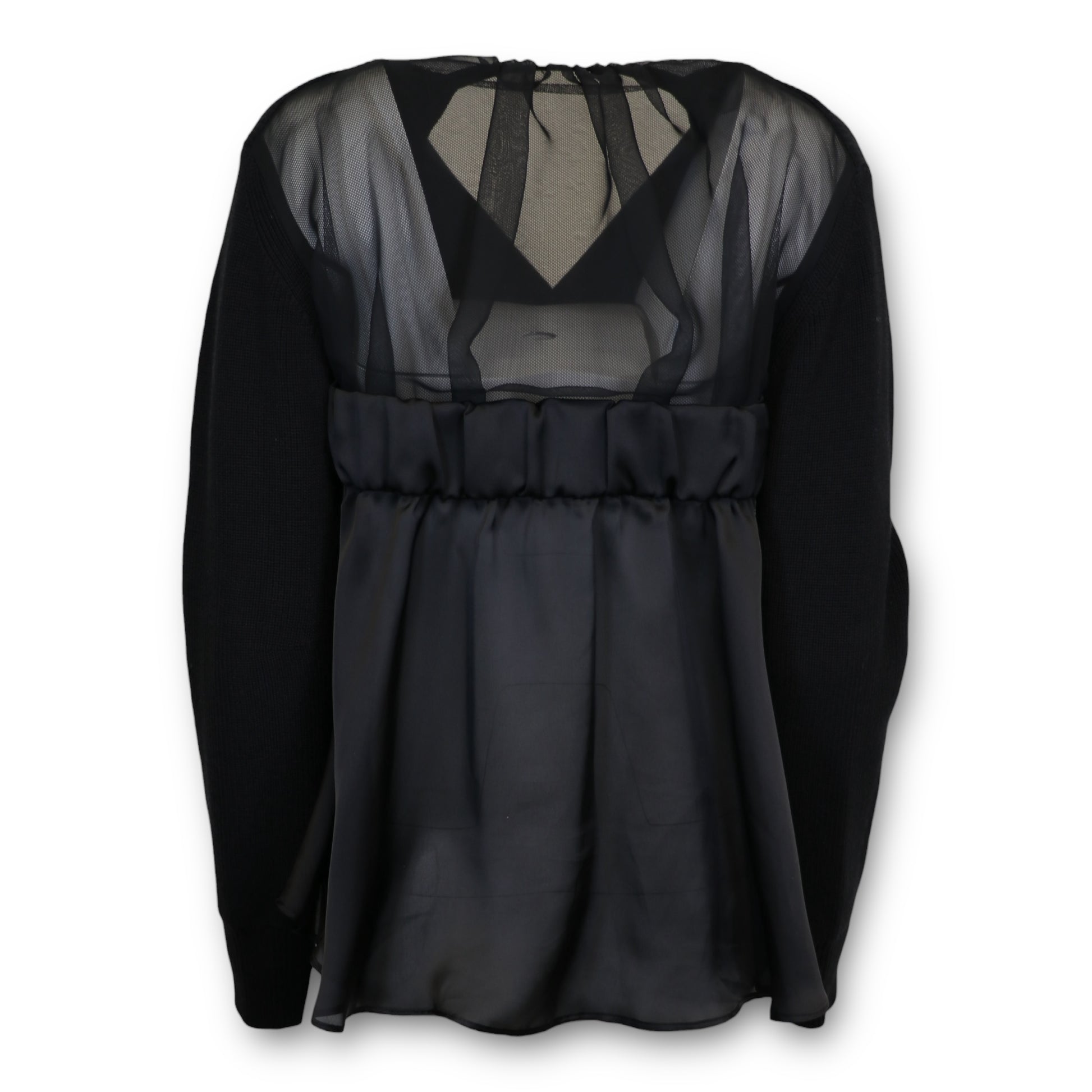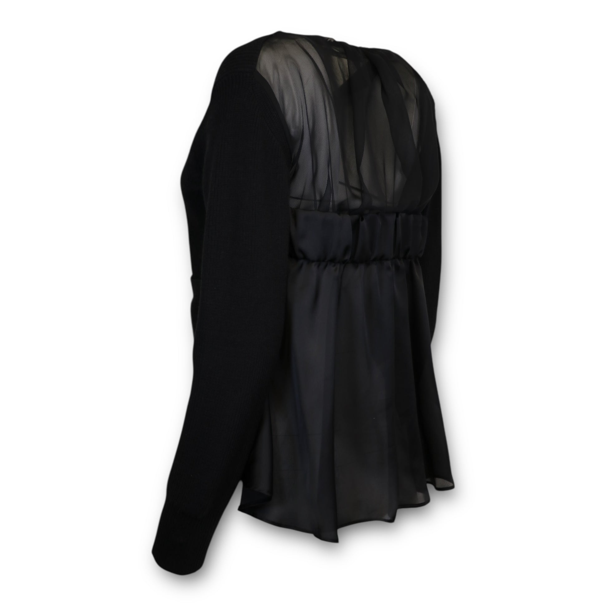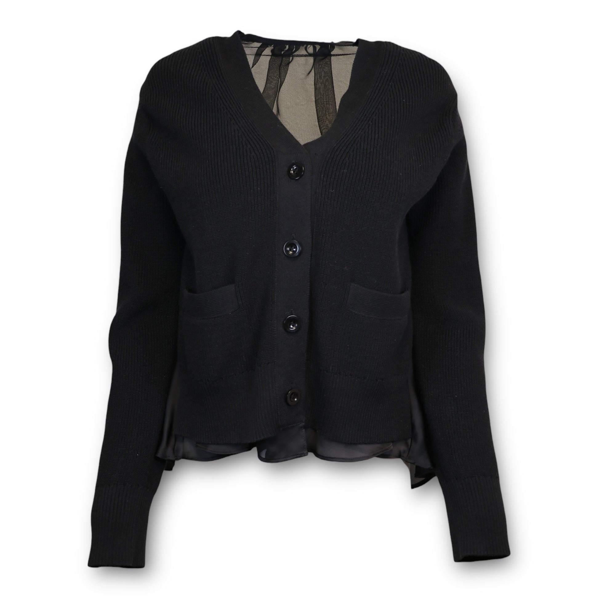 Den spannenden Kontrast bildet das Rückenteil aus transparentem Mesh, das dem Cardigan eine leichte, fast schwebende Wirkung verleiht. Das Mesh ist fliessend gearbeitet und fällt locker, wodurch eine feminine Silhouette entsteht. Dieses Materialspiel sorgt für Tiefe, Bewegung und einen subtilen Wow-Effekt – typisch für Sacais avantgardistischen Ansatz.