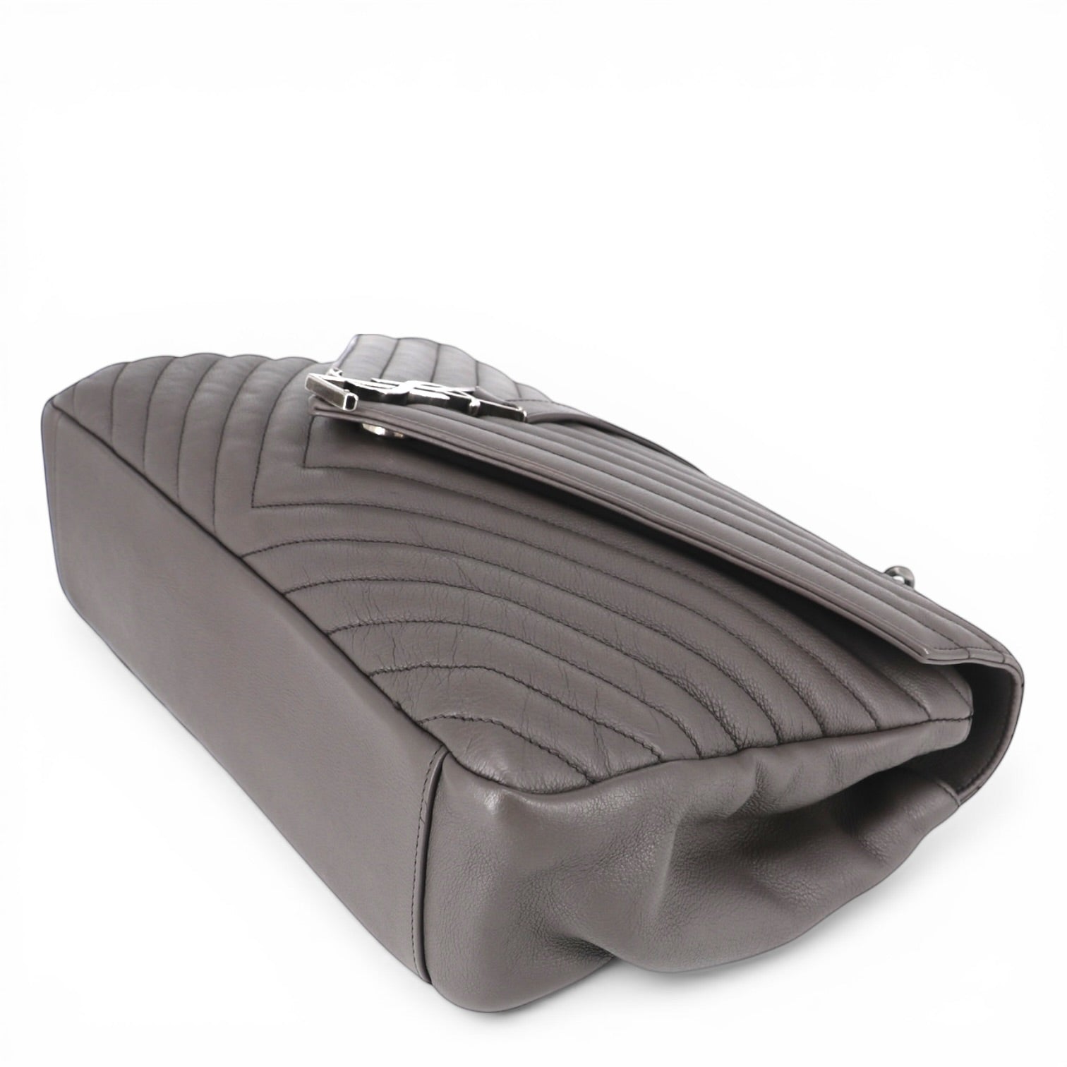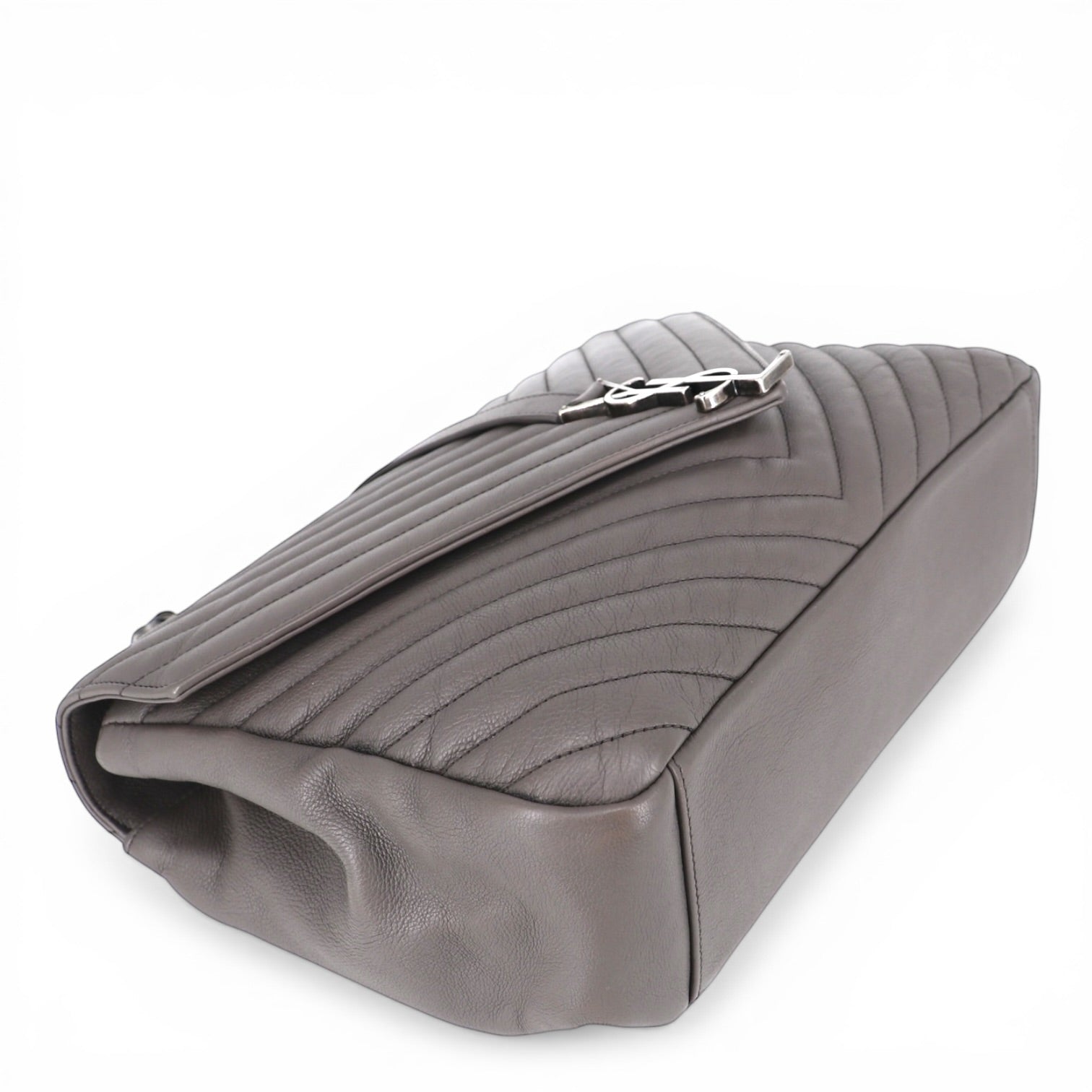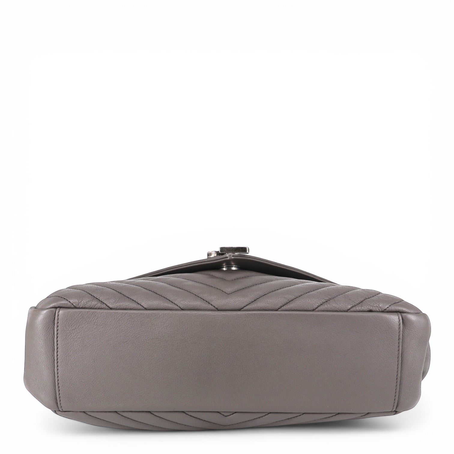 Die Tasche ist aus hochwertigem grauem Leder mit Chevron-Steppmuster gefertigt, das der Oberfläche eine elegante Struktur und eine luxuriöse Haptik verleiht. Das markante V-förmige Steppmuster ist ein charakteristisches Designelement der College-Linie und unterstreicht die moderne, stilvolle Optik.