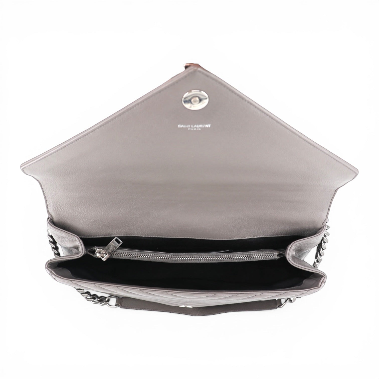Auf der Vorderseite befindet sich das ikonische YSL-Monogramm aus Metall, das sofort die Handschrift des Hauses Saint Laurent erkennen lässt.
