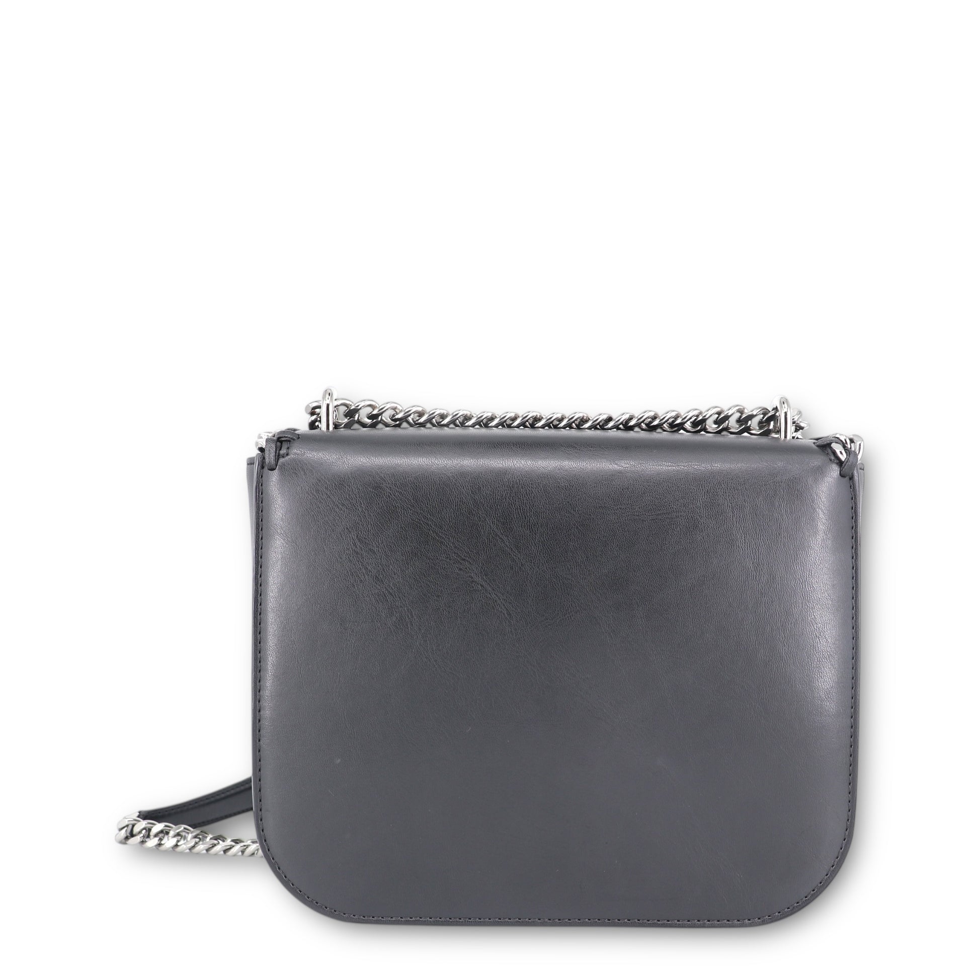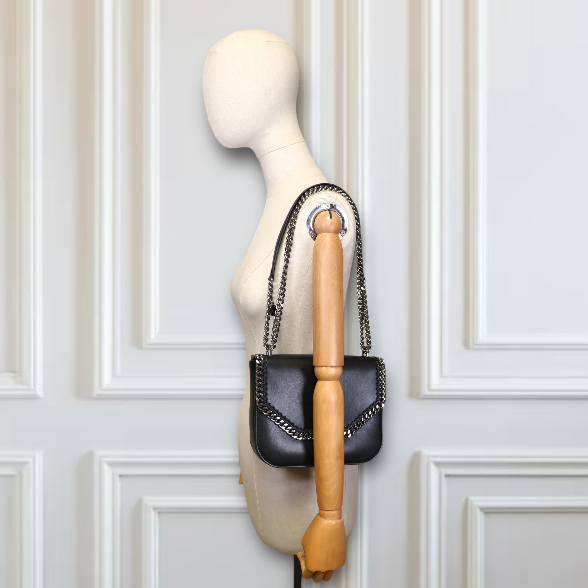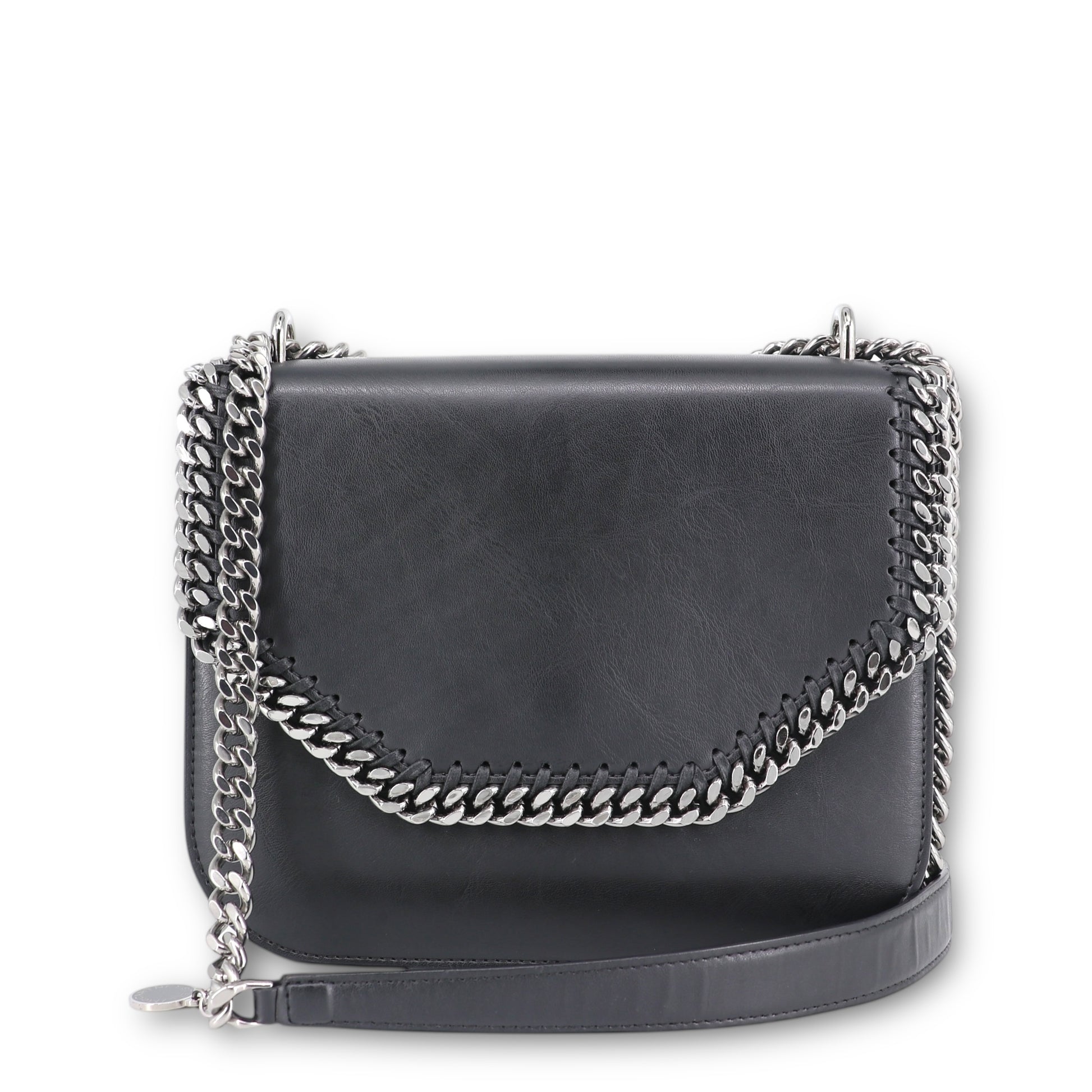 Aussen präsentiert sich die Tasche in schwarzem, veganem Leder mit praktischem Magnetverschluss. Der silberfarbene Kettenriemen verfügt über ein Schulterpolster und kann sowohl einfach als auch doppelt getragen werden. Im Inneren sorgt das rote Textilfutter für einen markanten Kontrast und bietet mit einem grossen Hauptfach, einem flachen Einschubfach sowie insgesamt drei Unterteilungen optimale Organisation.