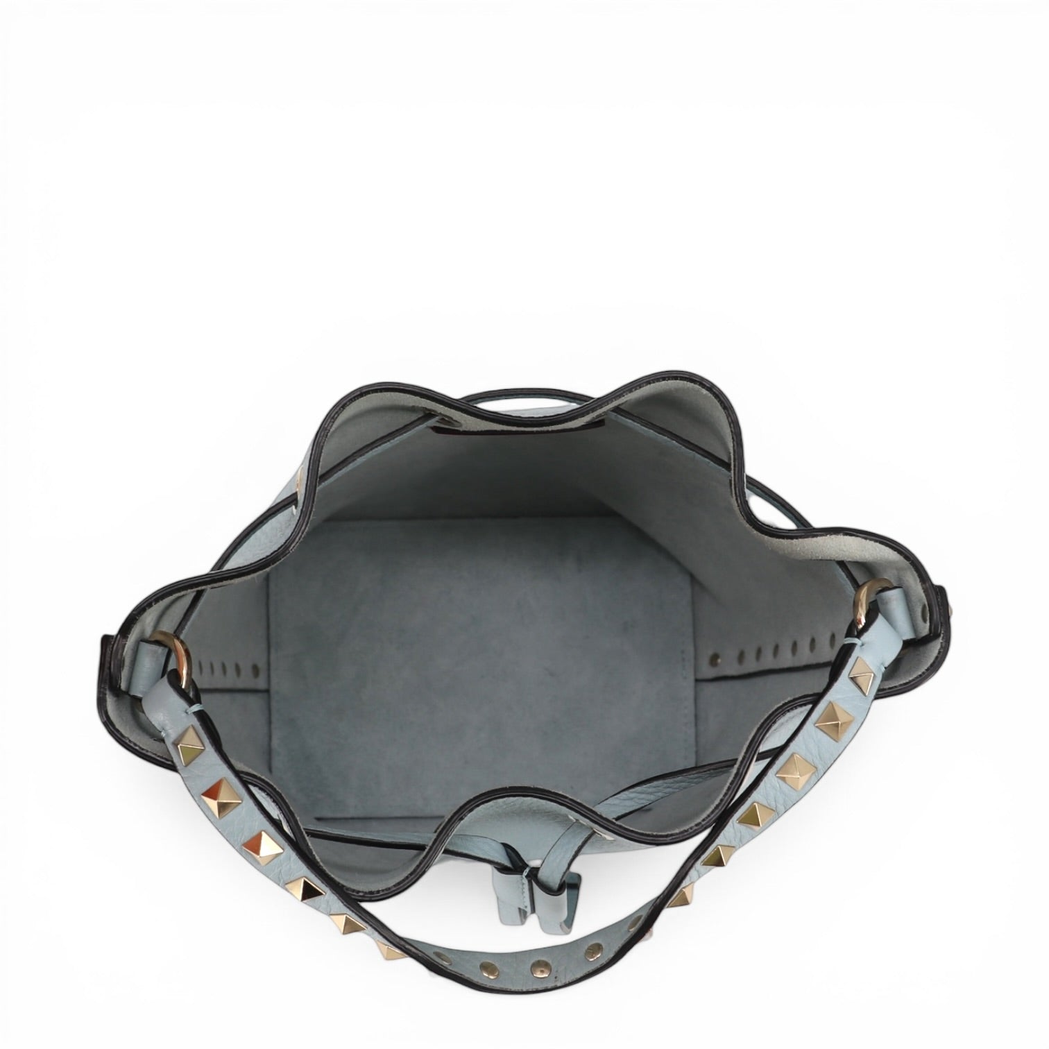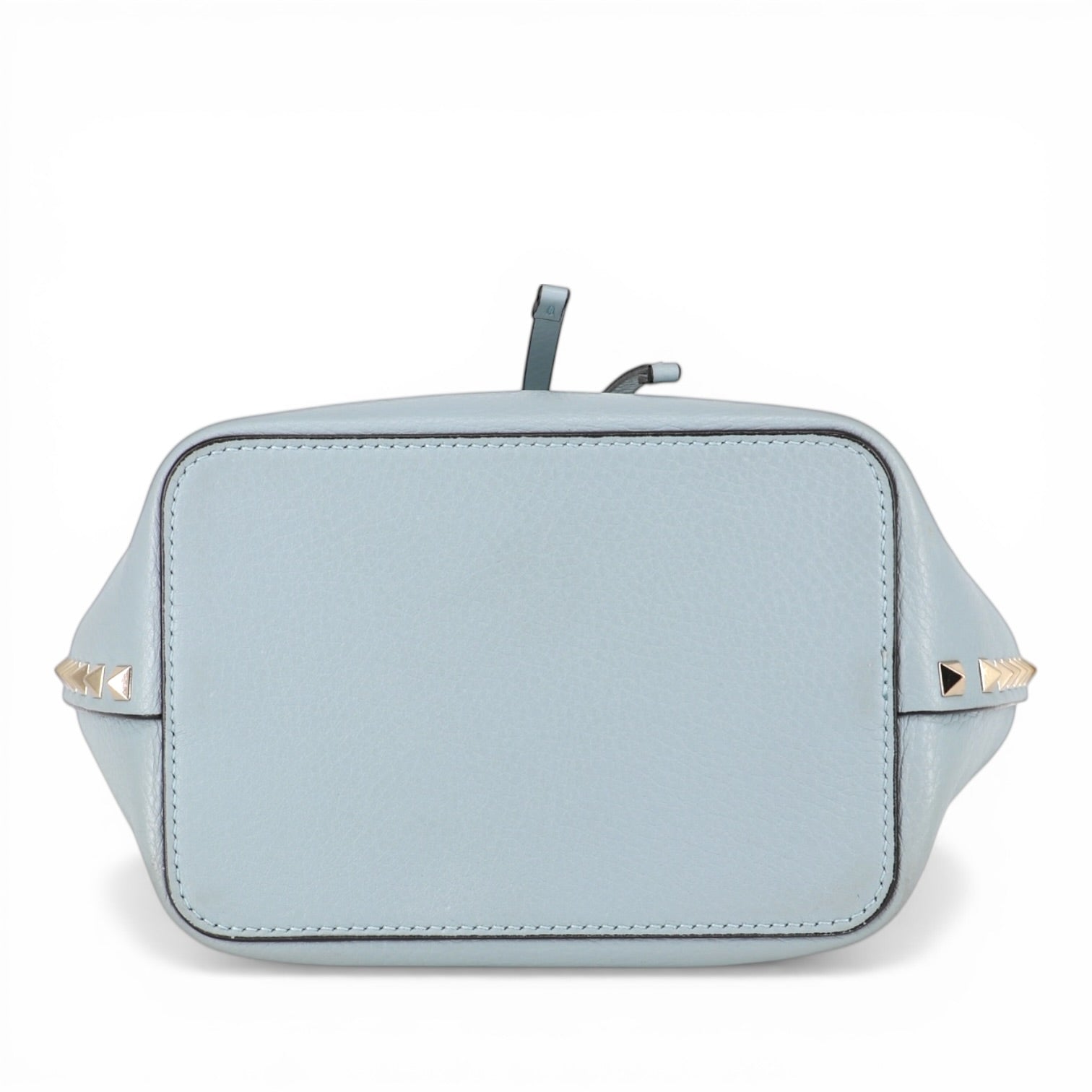 Gefertigt aus hochwertigem, fein genarbtem Leder in Hellblau, besticht die Tasche durch ihre weiche Haptik und ihre edle Ausstrahlung. Die klaren Linien der klassischen Bucket-Silhouette werden durch die charakteristischen goldfarbenen Rockstud-Nieten entlang der Kanten stilvoll akzentuiert.