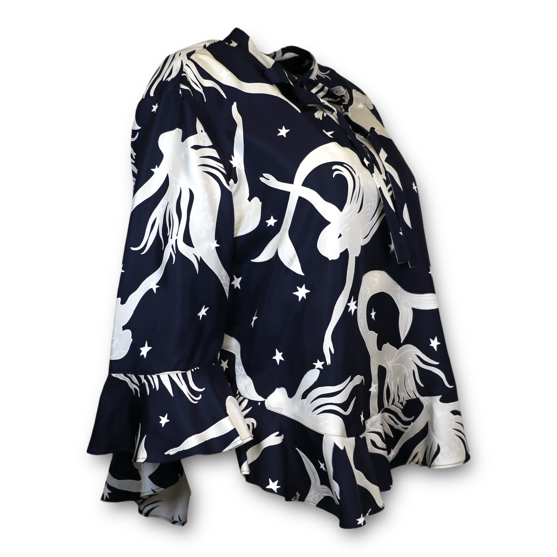 Ob kombiniert zu einer schlichten Stoffhose, einem Rock oder lässig zu Denim – diese Valentino Seidenbluse ist ein vielseitiger Begleiter für elegante Tageslooks wie auch besondere Anlässe. Ein exklusives Designerstück für Liebhaberinnen luxuriöser Materialien, raffinierter Prints und zeitloser Eleganz.