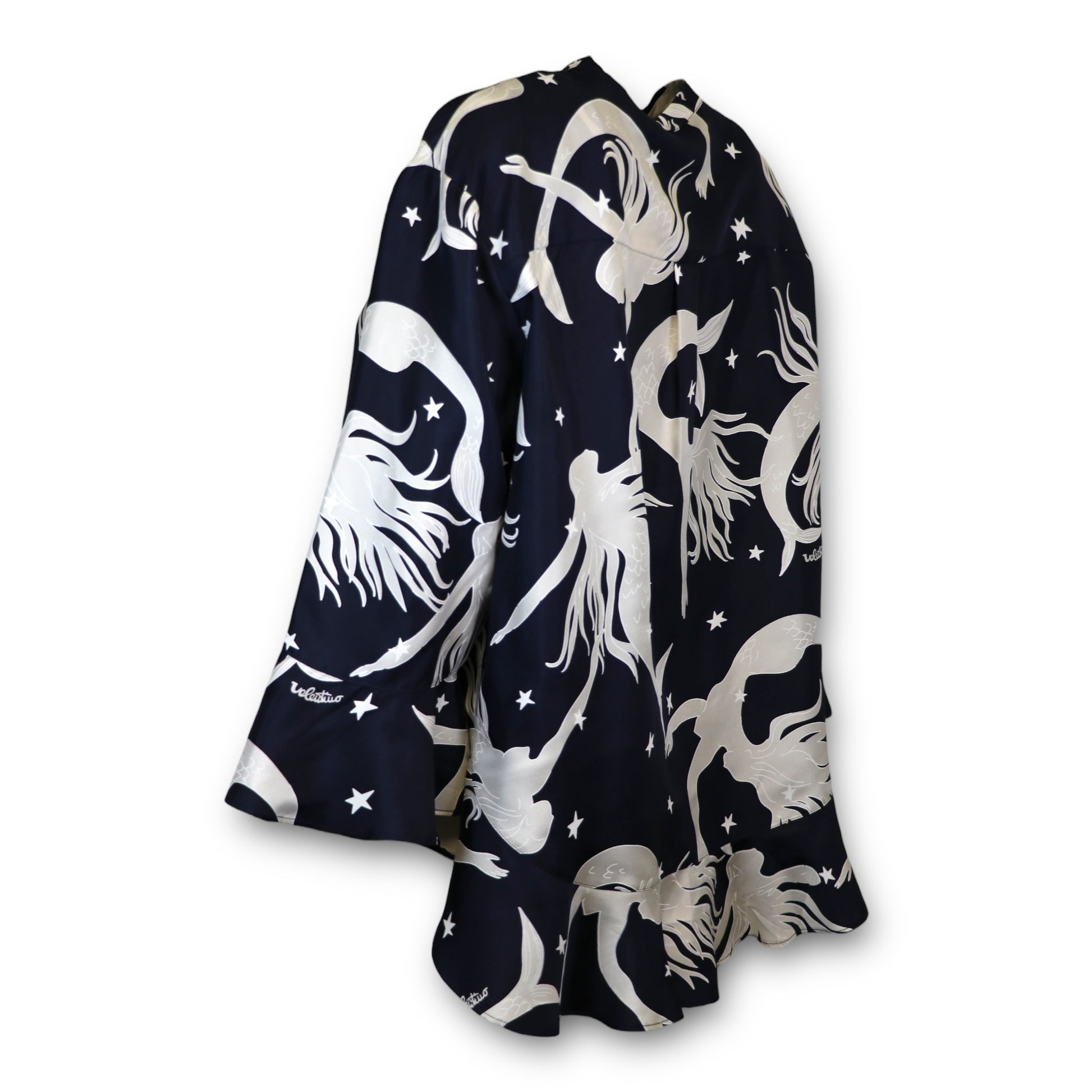 Das Highlight ist der auffällige Allover-Print in kontrastreichem Dunkelblau und Creme, der mit grafischen Tier- und Sternmotiven eine verspielte, zugleich stilvolle Optik schafft. Die Motive erinnern an eine moderne, märchenhafte Bildsprache und verleihen der Bluse eine künstlerische Note mit hohem Wiedererkennungswert.
